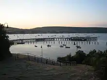 An older pier, opened 1860, was used by local quarries to ship stone, but it fell into decline with only its timber piles remaining today.