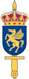 On 27 May 2009, the Supreme Commander of the Swedish Armed Forces, General Sverker Göranson, on behalf of His Majesty the King, handed over the new colour to the commander of the helicopter wing, Colonel Micael Bydén. The colour of the helicopter wing symbolizes the wing's origin from army, navy and air force helicopter units.[9] The colour took just over seven months to complete. The heraldic artist in this case is Kristina Holmgård and she who embroidered the colour is called Gertie Frid, with the help of Inger Broström and Gunnel Andersson.[10] The colour has a blue cloth with the air force's winged propeller with a crown. Since the Helicopter Wing has been part of the Air Force since 2003, the new colour is of the same model as the Air Force's other colours, with the exception that the royal crown over the winged propeller has a red lining. In the corners, the traditions from the previous units are carried on. In the place of honor, the inner, upper corner, there is a Pegasus that symbolizes the Helicopter Wing. In the other corners are the symbols for the Naval Aviation, Army Air Force and the Air Force's helicopter groups.[10][9]