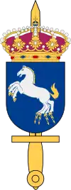 The coat of arms is used since 2001. Blazon: "Azure, a horse of eight legs rampant argent, mane, tail, hooves and flashes by the hooves or. The shield surmounting an erect sword, of the last colour".[7]