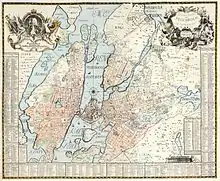 A commission to investigate the applications was appointed on 24 March 1746, and some weeks later on 14 May, they concluded that the directors from the first charter were best suited to lead the second as well.[64] However, the number of directors was increased from three to at least seven. In addition to Colin Campbell, Niclas Sahlgren and Teodor Ankarcrona, the directors were former secretary of the Executive Board Magnus Lagerström, the Stockholm merchants Anders Plomgren and Abraham Grill. These six members of the board later elected Claes Grill, Jacob von Utfall Jeanson, S. N. Wenngren and Nils Ström as directors.[65]
