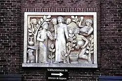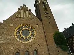 The church is designed in the Jugendstil style and is built in a hard-burnt brownish brick. The complex includes church halls, community centre, offices, rectory, staff houses, archives and storage rooms.[3] The exterior wall contain a relief designed by Danish artist Henrik Starcke (1899–1973). [6]