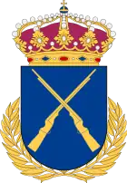 The coat of the arms of the Swedish Infantry Officers’ College (Infanteriets officershögskola, InfKAS) 1981–1995. This coat of arms was later used by the Combat School Middle (Stridsskola Mitt, SSM) 1995–1999. Blazon: "Azure, two muskets in saltire or. The shield surrounded by an open chaplet of laurels or".[5]