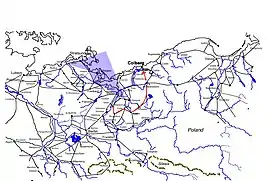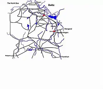 Meanwhile, stationed at Pasua and Elbing (to the far east), Oxenstierna was seeking to move towards the king. The cities that were critical to establishing a land route between the two armies was Kolberg (occupied by the Imperialists) and Cammin. Knyphausen and Oxenstierna were entrusted with the task of establishing a land route between Prussia and Swedish occupied Pomerania.[61] Meanwhile, being August as it was, the king was contemplating the establishment of winter quarters.[61] However, the Administrator of Magdeburg, Christian William declared in favor of the Swedish, drove out the Imperial garrison and called the Swedes to aid the city. This was done without the king's prior knowledge, and there were many objects which the king deemed to be of higher importance than the city of Magdeburg. It is not likely the king would have encouraged such a move if he had been consulted about it. The king still wanted to march to the Elbe,[61] take possession of the duchy Mecklenburg and engage in negotiations with Hamburg and Lübeck. Magdeburg was much too far away, and there were large contingents of Imperial troops between the Swedish army and Magdeburg. However, the king sent a colonel, Dietrich von Falkenberg, to the city and ordered him to bring the city into the highest level of defense for an anticipated siege by the Imperials.[62]