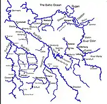 Ueckermünde and Barth (to the west of Stralsund) were also taken without incident.[58] Wolgast was besieged, and although the garrison gave up the city to the Swedes they held out in the citadel of the city.[58] This garrison hung onto the citadel until the 16th of August.[58] Treptow[57] was also taken.