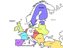 Bogislaw XIV, Duke of Pomerania, pledged his assistance as well, but he was desperately isolated. The Margraviate of Baden as well as William of Hesse also pledged their support.[37] However, even once the Swedes were in Germany they expressed a great deal of reluctance and had to be constantly cajoled and browbeaten into contributing their resources to the cause. The only ardent supporters of the Protestant cause were the dukes of Hesse-Kassel and Brunswick-Lüneburg. These evangelical princes held themselves in complete readiness to join hands with the Swedish. Although little favored the Protestant cause at the time, there was unrest in the entirety of Germany as a result of the horrible atrocities that the catholic armies incurred, on Catholic and Protestant states alike.[40] Everyone alike in Germany, as well as elsewhere in Europe – France, always fearful of the Habsburgs – feared Ferdinand II and the increasing resources that he could bring to bear. France was in favor of Swedish intervention, but because France was also Catholic, and Cardinal Richelieu, France's de facto prime minister, did not desire to openly declare against Catholicism, only offered monetary contributions. However, France refused Gustavus' demands for contributions. He demanded a lump sum upfront, and 600,000 Rixdollars[lower-alpha 2](or 400,000 talers[34]) per year subsequently.