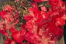 "Alma King", the largest known rhodochrosite crystal, from the Sweet Home Mine. It measures 14 cm x 16.5 cm.[1]