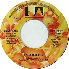 "Sweet Sexy Eyes" was first released on Lane's fifth studio album in March 1980 titled Ask Me to Dance. On the disc, the song was titled "Sexy Eyes".[4] In August 1980, it was issued as a single on United Artists Records under the name "Sweet Sexy Eyes". It was backed on the B-side with the song "Maybe I'm Thinkin", which was also taken from Lane's fifth studio album.[3] Spending multiple weeks on the Billboard Hot Country Singles chart, "Sweet Sexy Eyes" eventually peaked at number eight on the survey. It was her final single to reach a top ten position on the chart.[5] In addition, the single also peaked at number 16 on the RPM Country Songs list in Canada, becoming her final top 20 single there.[6] "Sweet Sexy Eyes" received positive reviews from writers, including Greg Adams who called its production "slick pop", along with Lane's "well-enunciated" singing style.[1] Lindsay Planer of AllMusic described it as a "power ballad" that demonstrated "Lane's ability to effortlessly vacillate between edgier material and a comparatively affective performance style."[7]
