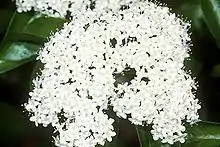 The flowers are creamy white, 9 mm diameter; the calyx is urn-shaped, five-toothed, persistent; the corolla is five-lobed, with rounded lobes, imbricate in bud; the five stamens alternate with the corolla lobes, the filaments slender, the anthers pale yellow, oblong, two-celled, the cells opening longitudinally; the ovary is inferior, one-celled, with a thick, pale green style and a flat stigma and a single ovule. The flowers are borne in flat-topped cymes 10 cm in diameter in mid to late spring. The fruit is a drupe 1 cm long, dark blue-black with glaucous bloom, hangs until winter, becomes edible after being frosted, then eaten by birds; the stone is flat and even, broadly oval. Wherever it lives, black haw prefers sunny woodland with well-drained soil and adequate water.[3][4][5][6]