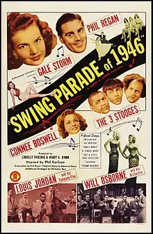 Swing Parade of 1946 is a 1946 musical comedy film directed by Phil Karlson and released by Monogram Pictures. The film features Gale Storm, Phil Regan, and The Three Stooges (Moe Howard, Larry Fine and Curly Howard), Edward Brophy and musical numbers by Connee Boswell and the Louis Jordan and Will Osborne (singer) orchestras, including "Stormy Weather" and "Caldonia".
