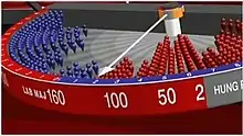 The swingometer is a graphics device that shows the effects of the swing from one party to another on British election results programmes. It is used to estimate the number of seats that will be won by different parties, given a particular national swing (in percentage points) in the vote towards or away from a given party, and assuming that that percentage change in the vote will apply in each constituency. The device was invented by Peter Milne, and later refined by David Butler and Robert McKenzie.
