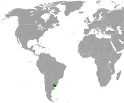 During both World Wars, Switzerland acted as an intermediary between Uruguay and Germany. Near the end of World War I, in 1918 and following an incident where a German submarine captured a delegation sent by Uruguay to France, "Uruguay caused Germany to be asked through Switzerland, whether Germany understood a state of war to exist between the two countries."[10] Again, during World War II, Switzerland, as protecting power, represented Uruguay in Germany, Italy, Hungary and France.[11]