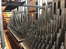 Ranks of metal pipes with wooden tracker-action struts visible. In the background are louvres of the oberwerk enclosed division.