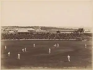 Soon after Gregory's 1878 Australian team returned home, Lord Harris's Englishmen arrived.[11][30] Australia won the first match, played at the Melbourne Cricket Ground, by 10 wickets.[31] The match was later recognised as the third Test match in history.[31] New South Wales paceman Fred Spofforth—nicknamed "The Demon" because of his ferocious pace—took 13 wickets in the match,[32] including the first ever Test hat-trick.[33] The next tour match was against New South Wales and started on 24 January at the Association Ground in Sydney. New South Wales won by five wickets,[34] despite the absence of Spofforth—who withdrew from the home side after spraining his wrist the night before the start of the match—[31][35] and Gregory, who had been dropped for missing a training session and failing to provide an explanation for his absence.[31]