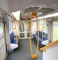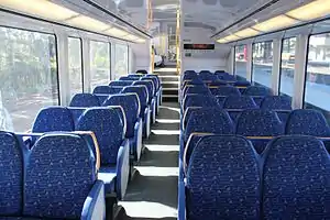 The Millennium train, like the entire Sydney Trains fleet and electric NSW TrainLink fleet, is a double decker. It is a four car consist, with the middle two cars being non-control motor cars and the two outer cars being driving control trailer cars fitted with the pantograph.[5] The Millennium train was the first to be equipped with an AC drive system unlike the Tangara, which has a DC drive system. The sets usually operate in eight-car formations with two four-car sets combined. While the Millennium train concept is an evolution of the Tangara concept (manufactured by A Goninan & Co), the Millennium train introduced new features such as internal electronic destination indicators, automated digital voice announcements for upcoming stops, a return to reversible seating, surveillance cameras, wider stairways, a new safety yellow colour scheme, and push-button opened internal doors. The Millennium Train also introduced crumple zones to absorb impact in a collision. Interiors were designed by Transport Design International.[6]