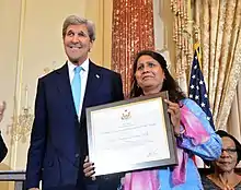 ![]() Syeda Ghulam Fatima during the ceremony of Avrora Prize, Leymah Gbowee, Syeda Ghulam Fatima, Vartan Gregorian. She is standing next to John Kerry. | |