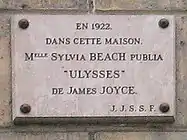 In July 1920, Beach met Irish writer James Joyce at a dinner party hosted by French poet André Spire. Soon after, Joyce joined Beach's lending library.[6] Joyce had been trying, unsuccessfully, to publish his manuscript for his masterpiece, Ulysses, and Beach, seeing his frustration, offered to publish it.[7] Shakespeare and Company gained considerable fame after it published Ulysses in 1922, as a result of Joyce's inability to get an edition out in English-speaking countries.[8][9] Beach would later be financially stranded when Joyce signed on with another publisher, leaving Beach in debt after she had bankrolled, and suffered severe losses from, the publication of Ulysses.[1]
