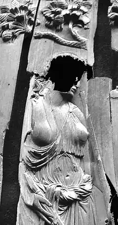 The diptych was produced in Rome sometime between 388 and 401.[1] The Nicomachi panel measures 29.9 × 12.6 centimetres (11.8 × 5.0 in), that of the Symmachi is 29.8 × 12.2 cm (11.7 × 4.8 in). Both wings depict female figures engaged in religious ritual before sacrificial altars. The Nicomachi tablet in Paris is the less well preserved of the pair, having been damaged in a fire. The ivory is fractured in several places, with some sections missing completely, together with high-relief areas such as the female figure's face, left hand and right arm. This figure stands before a round altar, holding two lit torches now partially missing. Cymbals hang from a pine tree overhead; both the tree and its hangings are attributes of the goddess Cybele and her consort Attis.[4]