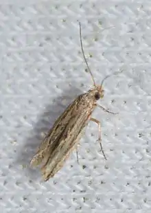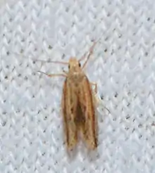 The wingspan is 11–13 mm. The forewings are light brown or brownish ocherous, sparsely speckled with black. There is a subcostal black, longitudinal line extending from the base to the apex, curving upward slightly and intensifying at the latter. Beneath this, two more or less definite blackish striations, the one on the inner margin being quite broad and diffused, while the discal streak is variable, not continuous, often consisting of two or three dashes. The hindwings are silken, ashy white, shading to cinereous (ash gray) at the tips.[4]