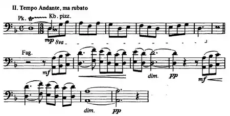 In his villa in Rapallo, Sibelius wrote: "Don Juan. I was sitting in the dark in my castle when a stranger entered. I asked who he could be again and again – but there was no answer. I tried to make him laugh but he remained silent. At last the stranger began to sing – then Don Juan knew who it was. It was death."[12] On the same piece of paper, he wrote the bassoon theme for the first part of the second movement, out of which a pizzicatoed string "walking bass" stems. Two months later in Florence, he drafted the second theme, with a note reading "Christus," perhaps symbolizing the death and resurrection of the movement, or even of Finland.[2] Scholars also suggest that Sibelius modeled the second movement after Dante's Divine Comedy. Nonetheless, Robert Kajanus said that the movement "strikes one as the most broken-hearted protest against all the injustice that threatens at the present time to deprive the sun of its light and our flowers of their scent."[13] The movement culminates with a towering, brassy theme, following by an ethereal, mist-like motif in the divided strings.[14]