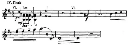 Without pause, the final movement, toward which the rest of the symphony seems to be building, begins gloriously after finally attaining D major, with colossal, loud, regal, and triumphant themes, often drawn from the first movement of the symphony.[15] Very similar to Beethoven's Symphony No. 5, the transitional material from between the last two movements is brought back a second time so the victory of the major key can be savored anew.[14] This movement, inspired by Romantic music, is "Italian music gone North."[16] Kajanus wrote that the last movement "develops towards a triumphant conclusion intended to rouse in the listener a picture of lighter and confident prospects for the future."[7]