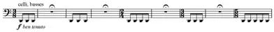 The low strings also begin a rhythmic pattern which can be found throughout the movement, often in higher voices (a similar procedure can be found in the second movement). A number of melodies in this finale also consist of an upwards tritone leap followed by a chromatic descent.