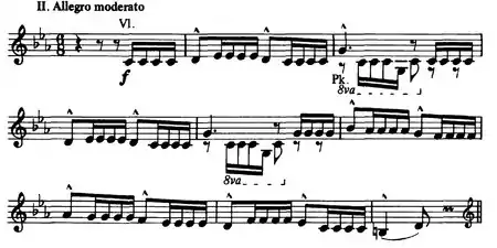 The second movement opens with an energetic string melody, which gives way to a presto version of the main theme, complete with extremely rapid scale passages in the piano.