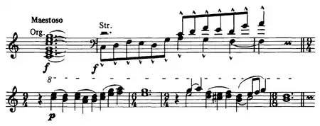 It has also been suggested that themes within the symphony could be derived from the Gregorian plainsong melody Dies Irae, the Sequence for the Roman Catholic Requiem Mass.[11][12] While this may not constitute as straightforward a use of the Dies Irae theme as can be found in such works as the Totentanz of Franz Liszt, the Maestoso melody and chord progression might also be seen as a direct quote of the Ave Maria attributed to Franco-Flemish Renaissance composer Jacques Arcadelt from an 1842 arrangement by French composer Pierre-Louis Dietsch (1808-1865), which Liszt also arranged for solo piano and published in 1865 as Chanson D'Arcadelt "Ave Maria" (S.183).
