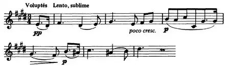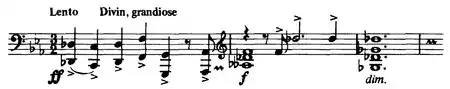 - The first movement begins with the main theme in the violins and is taken up in the basses and gradually works up to a climax. As it dies away a hymn-like theme appears in the muted strings. The second melody follows in the woodwinds with violins and bass accompaniment, this in turn followed by a theme reminiscent of the "Dresden Amen" in a long tremolo, the trumpets giving out their original theme, to full accompaniment. After recapitulation the main theme appears in the horns, the violins in agitated accompaniment. The close of the section is vehement, gradually dying away and leading to the second movement without halt.