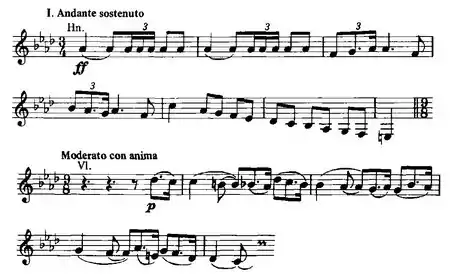 - The symphony opens with horns and woodwinds, and trumpets join with a higher A♭. As the music solidifies into large, slow syncopated chords, Tchaikovsky unleashes the musical equivalent of lightning bolts: two short fortissimo chords, each followed by a long measure of silence. As the music ebbs away, the woodwinds hint at the main melody, which is properly introduced by the strings at the Moderato con anima. (The score at this point is marked "In movimento di Valse", as it is written in 9
