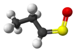 syn-propanethial S-oxide (or (Z)-propanethial S-oxide), a member of a class of organosulfur compounds known as thiocarbonyl S-oxides (formerly "sulfines"),[2] is a volatile liquid that acts as a lachrymatory agent (triggers tearing and stinging on contact with the eyes). The chemical is released from onions, Allium cepa, as they are sliced. The release is due to the breaking open of the onion cells and their releasing enzymes called alliinases, which then break down amino acid sulfoxides, generating sulfenic acids. A specific sulfenic acid, 1-propenesulfenic acid, formed when onions are cut, is rapidly rearranged by a second enzyme, called the lachrymatory factor synthase or LFS, giving syn-propanethial S-oxide.[3] The gas diffuses through the air and, on contact with the eye, it stimulates sensory neurons creating a stinging, painful sensation. Tears are released from the tear glands to dilute and flush out the irritant.[4] A structurally related lachrymatory compound, syn-butanethial S-oxide, C4H8OS, has been found in another genus Allium plant, Allium siculum.[5]