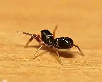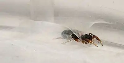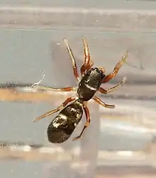 These spiders are virtually indistinguishable from ants, even for humans looking at them rather closely. They move rapidly like an ant, and even raise their second pair of legs like an ant's antennae. Hand-raised tits that had never come in contact with ants ate spiders of this species readily. However, after their first encounters with real ants, and the nauseating effect of their formic acid, they refrained from eating S. venator.[1]