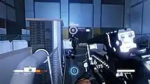 Unlike the original series of games, Syndicate is a first-person shooter set in 2069. Players assume control of Miles Kilo, an augmented agent working for EuroCorp in a corrupted, deceitful world in which corporations compete with each other for power.[1] Players can run, jump, slide, hide behind covers, and carry two weapons and grenades to defeat enemies and bosses, who each have unique abilities.[2] The game features 19 weapons,[3] ranging from assault rifles, rocket launchers and machine pistols, to futuristic weapons such as laser rifles, Gauss Guns with bullets that can track enemies automatically, and Riotlance Dark Shooters that can paralyze enemies for a short time.[4] Weapons can be customized and upgraded with 87 attachments and 25 upgrade options.[5] These upgrades may alter the nature of these weapons, transforming standard ammunition to cover-penetrating ammunition.[6] The game also features an "execution" mechanic, allowing players to perform melee takedowns.[7]
