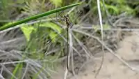 Synlestes weyersii is a large to very large damselfly, coloured a metallic bronze-black to green-black with yellow markings. It perches with its wings partially or fully outspread.[6]