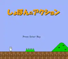 Syobon Action was released as freeware for Windows in February 2007. The game was designed by independent Japanese game developer "Chiku", and was inspired by The Big Adventure of Owata, a similar game released through the Japanese 2channel message board a year prior. Chiku chose to make his game a spoof of Super Mario Bros. due to its massive recognition and popularity. The first stage was completed in three days and presented at a cultural festival hosted at his college campus, becoming the most popular work presented. A video showcasing the demo was uploaded to his Niconico account a few days later and garnered over 1000 views shortly after, which prompted Chiku to make the demo a full game. Three new stages were produced within the span of two weeks.[3] The music of the game consists mainly of covers of songs created for other video games such as Spelunker, Ghosts 'n Goblins and Puyo Puyo.[4]