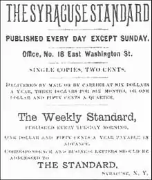 The Post-Standard was founded in 1829 as The Onondaga Standard.[2] The first issue was published Sept. 16, 1829, after Vivus W. Smith consolidated the Onondaga Journal with the Syracuse Advertiser under The Onondaga Standard name. Through the 1800s, it was known variously as The Weekly Standard, The Daily Standard and The Syracuse Standard.