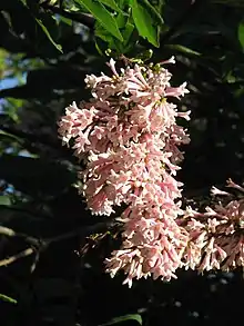 - Flowers: Panicles are lateral to terminal, erect, and loose, and measure 10–25 cm x 4–12 cm. Pedicel to 1-1.5mm in length. Calyx reaches 2.5-3mm. Corolla measures 1-1.7 cm in length and ranges in colour from white to pink or lilac-red. Tube is slightly funnelform, and measures 0.8-1.4 cm. Lobes are elliptic to ovate and spreading. Anthers are yellow and reach to the mouth or the corolla tube or protrude slightly. Flowers from June–July.[2]