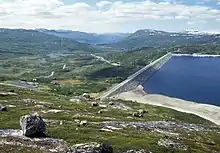 The Sysen Dam (Norwegian: Sysendammen) is a rock-fill embankment dam in the municipality of Eidfjord in Hordaland, Norway. The dam is 1,157 meters (3,796 ft) long, 81 meters (266 ft) high, and 258 meters (846 ft) wide at its base. It is built of 3.6 million cubic meters (130×106 cu ft) of stone and moraine deposits.[1][2]