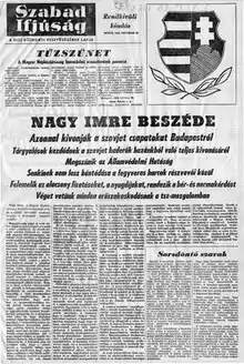 Szabad ifjúság ('Free Youth') was a Hungarian newspaper, and the organ of the Union of Working Youth. Szabad ifjúság began publishing on March 3, 1950. It was published weekly from October 1950 to July 1951, and daily from August 1951 to October 1956. It was later replaced by Magyar ifjúság.[1]