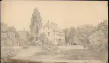 The Neoclassical main building is from 1798. The two-storey building is nine bays wide. On each side of the building is a median risalit with four pilasters tipped by a triangular pediment. The roof is a half-hipped black-glazed tile roof with four chimneys. The building was originally the central wing in a three-winged complex but the two detached side wings have been removed.[3]