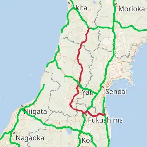 The expressway is incomplete in many areas, however it is planned to eventually be a continuous route spanning northern Fukushima, Yamagata, and southern Akita prefectures. As of July 2019, all gaps in the expressway are in the process of being eliminated, with all gaps in Fukushima set to be removed by March 2021.[3] North of the city of Shinjō, various expressway-standard roads (bypasses of National Route 13) make up the remaining distance to the city of Yokote in Akita Prefecture.[4]