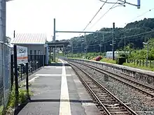 The station has two opposed side platforms connected by a footbridge. The station building is unattended.