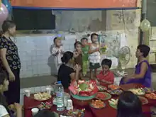According to Vietnamese custom, during the Tết Trung Thu, adults arrange parties for children to celebrate the Tết Trung Thu, buy and make all kinds of candle-lit lanterns to hang in the house and let the children process the lights.[2] The Tết Trung Thu includes moon cakes, candies, sugar cane, grapefruit and other fruits...[4]