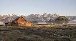 The barn is all that remains of the homestead built by Thomas Alma Moulton and his sons between about 1912 and 1945. It sits west of the road known as Mormon Row, in an area called Antelope Flats, between the towns of Kelly and Moose. Now lying within Grand Teton National Park, it is near the homestead of Andy Chambers. The property with the barn was one of the last parcels sold to the National Park Service by the Moulton family. Often photographed, the barn with the Teton Range in the background has become a symbol of Jackson Hole, Wyoming.[1]