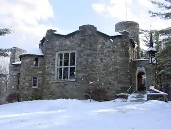 In 1976, Breitenbach began constructing by hand a small castle, on land given him by his father. The first stage was an octagon and tower, inspired by the Victorian-era book The Octagon House by Orson Fowler.[2] Fowler recommended the octagon as an ideal and economical shape for a house. For Breitenbach, it was also suited to a castle. In 1987 he added a large studio addition. Breitenbach quarried stones (some as long as 12 feet) from a nearby creek, cut trees for lumber, and salvaged a collapsing carriage barn for beams and siding.[5] He forged iron hardware, made leaded-glass windows, furniture, carvings, tilework, and a fresco, so that many of the arts would be represented. He intends to leave the castle and paintings behind as a museum. He would hire college students during the summer to help him. One of those, Dan Root of Edmeston NY, remembers where on rainy days the thrifty castle builder would have his help straighten out nails that were previously used in the construction of the home made scaffold systems.