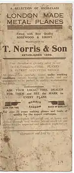 Thomas Norris is recorded as a joiners' tool-maker in Lambeth, Surrey by 1861,[5] living at 57 York Street.[6] A works address at 23 York Road, Lambeth, is also given on some tools and on the cover of the c. 1908 price list. Thomas James Norris, the eldest child of Thomas and Eliza Norris is recorded as a tool maker in the 1881 census and again in the 1891 census; by the 1911 census, however, he is recorded as living at 3 Sycamore Grove, New Malden, Surrey, with a "personal occupation" of "iron plane making & repairs for joiners and cabinetmakers also general tool dealers".