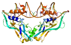 T-box transcription factor 2 Tbx2 is a transcription factor that is encoded by the Tbx2 gene on chromosome 17q21-22 in humans.[5][6][7] This gene is a member of a phylogenetically conserved family of genes that share a common DNA-binding domain, the T-box. Tbx2 and Tbx3 are the only T-box transcription factors that act as transcriptional repressors rather than transcriptional activators, and are closely related in terms of development and tumorigenesis.[8] This gene plays a significant role in embryonic and fetal development through control of gene expression, and also has implications in various cancers. Tbx2 is associated with numerous signaling pathways, BMP, TGFβ, Wnt, and FGF, which allow for patterning and proliferation during organogenesis in fetal development.[8]