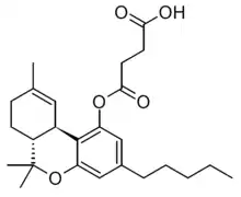 THC hemisuccinate (Δ9-THC-O-hemisuccinate, Dronabinol hemisuccinate) is a synthetic derivative of tetrahydrocannabinol, developed in the 1990s. It is a water-soluble prodrug ester which is converted into THC inside the body, and was developed to overcome the poor bioavailability of THC when taken by non-inhaled routes of administration.[1][2][3]