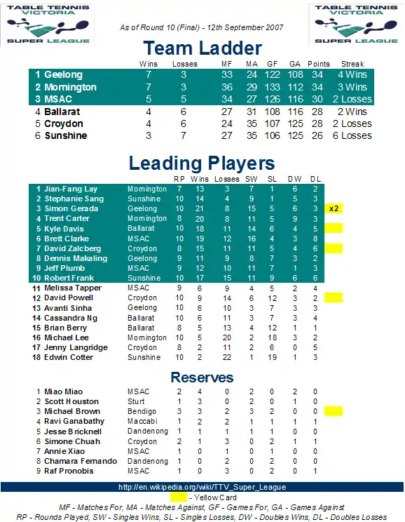 The Table Tennis Victoria Super League commenced on Good Friday, 6 April 2007, with its first ever Team Draft. The 2007 Table Tennis Victoria Super League brought 18 of Australia's top table tennis players together in a 10-week series involving 6 clubs. The stakes are high, only months away from qualification for the Beijing Olympics all players will want to make their mark. Each team will involve 2 male players and a female. All players are State or National representatives. On the day there were 26 athletes, 17 male and 9 female, vying for 12 male places and 6 female places on six teams. The clubs that will be contesting the inaugural season are –