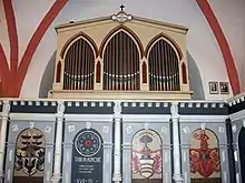 The christening bowl of 1671 shows the arms of the von Röbel family, who donated it. The parapet of the organ loft (17th century) features vivid flat carvings and again the arms of the von Röbel family. Two further sculptures of female saints (around 1430) belong to the furnishings. An oval epitaph commemorates Hans Christoph von Röbel (d. 1671). On the eastern outside wall, four plates recall the four major restructurings of the church in 1738, 1801, 1905, and 1924.