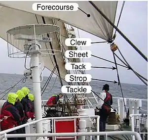 The tack of a square-rigged sail is a line attached to its lower corner.[1] This is in contrast to the more common fore-and-aft sail, whose tack is a part of the sail itself, the corner which is (possibly semi-permanently) secured to the vessel.